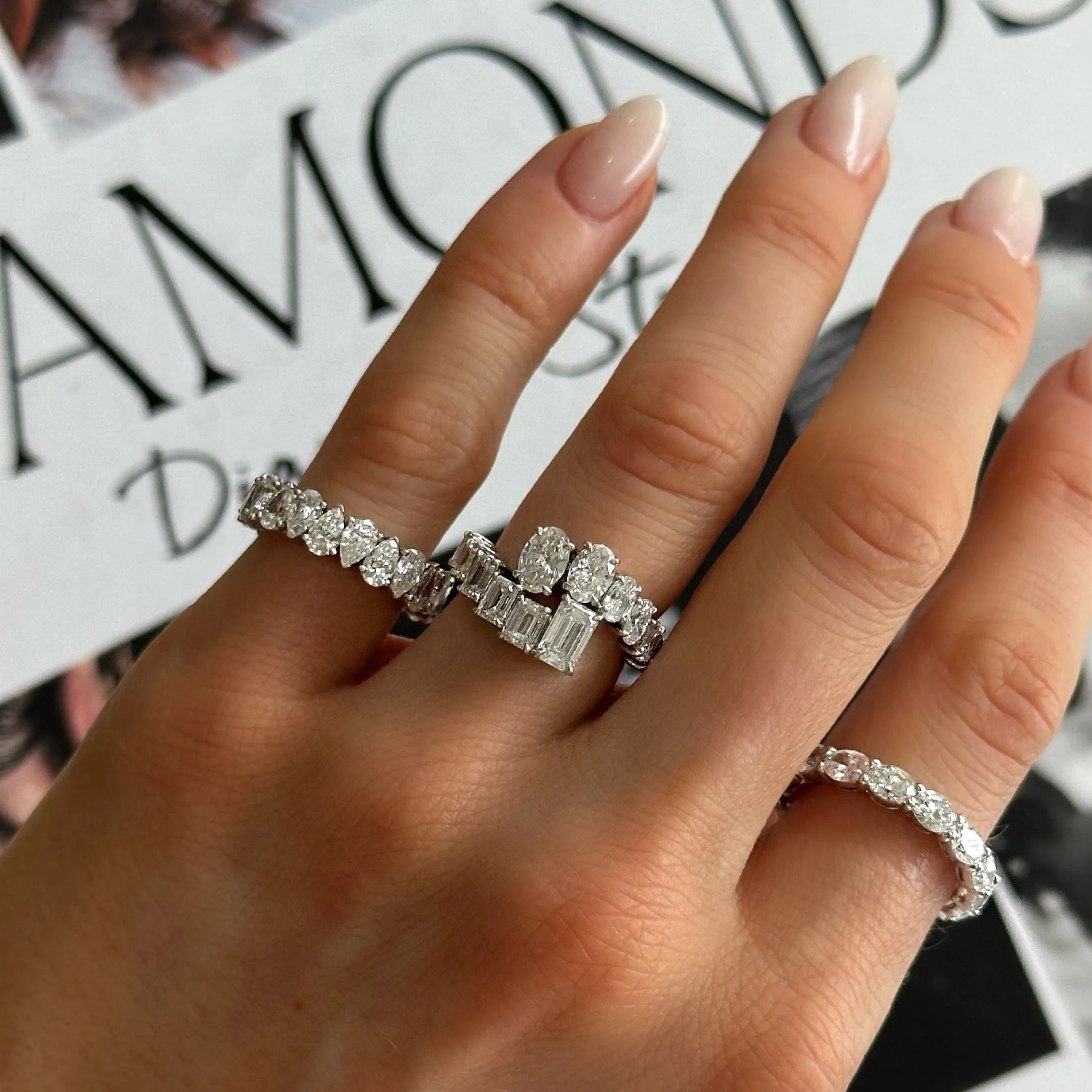A modern expression of movement and light. The Chantel Diamond Bypass Ring features fourteen graduating emerald- and oval-cut diamonds, set in a sculptural curve that wraps gracefully around the finger. Crafted in 18K yellow, white, or rose gold, it captures a balance of strength and softness, a timeless piece with a contemporary edge.