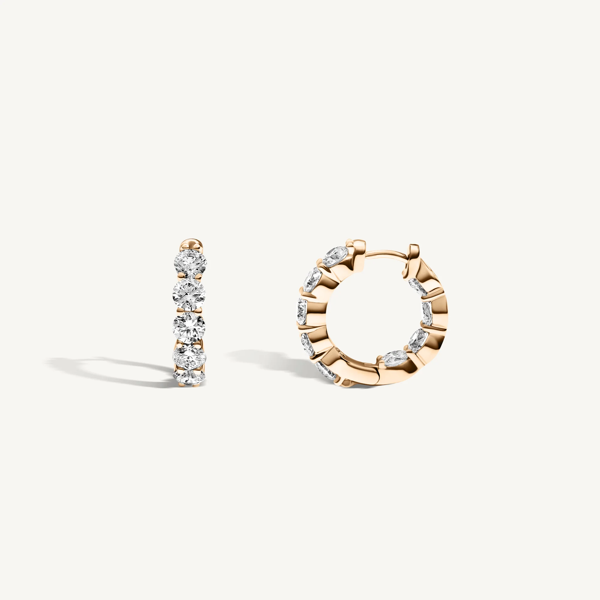 These diamond Huggies showcase round brilliant cut diamonds in a unique inside-out setting to ensure the jewels are always visible. This is a piece that will be cherished for a lifetime.