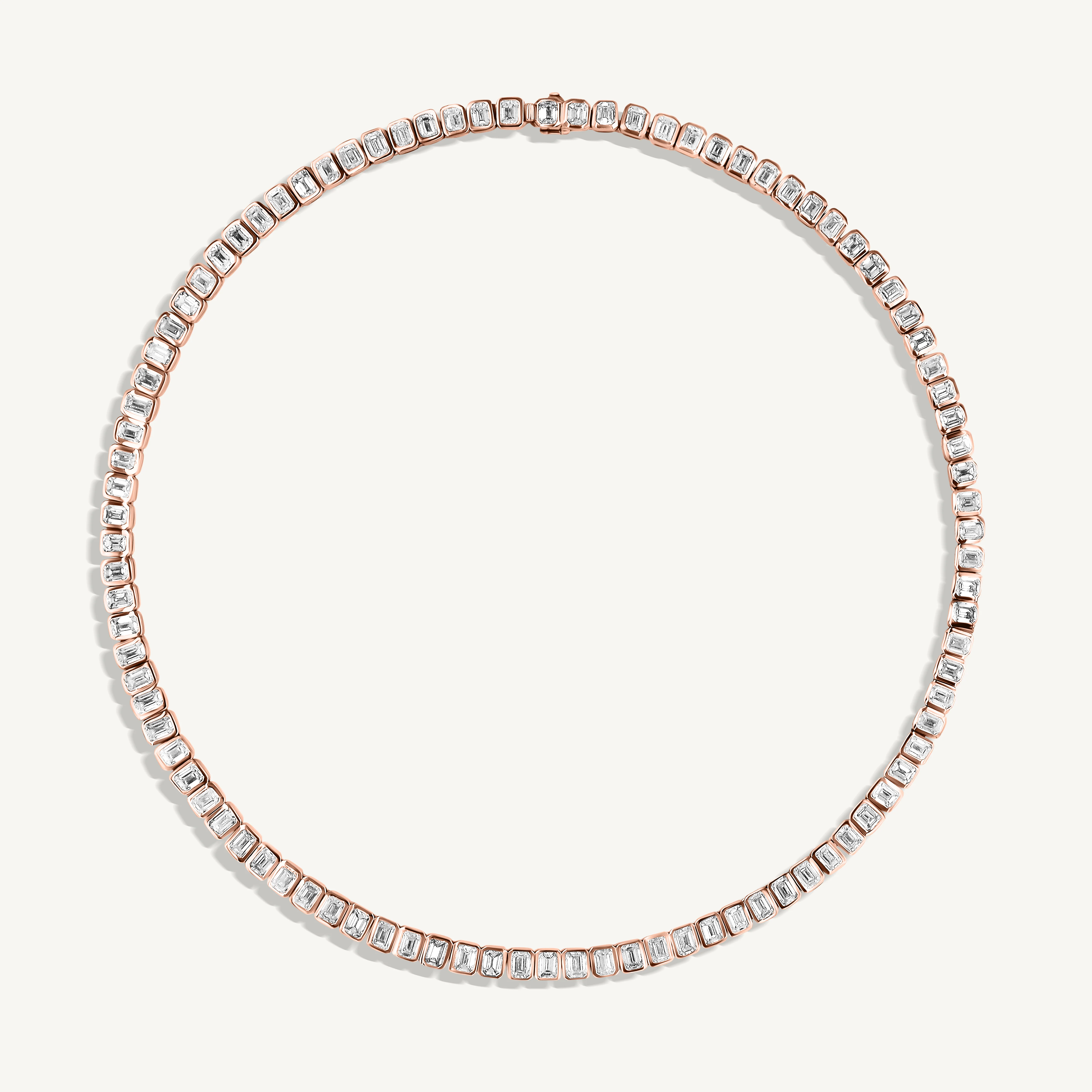 A bold expression of sophistication, the Emerald Cut Diamond Tennis Necklace is a timeless statement of refined luxury. Featuring a sleek bezel setting, each perfectly matched emerald-cut diamond is encased in gold, enhancing its natural brilliance while offering a contemporary, seamless design.