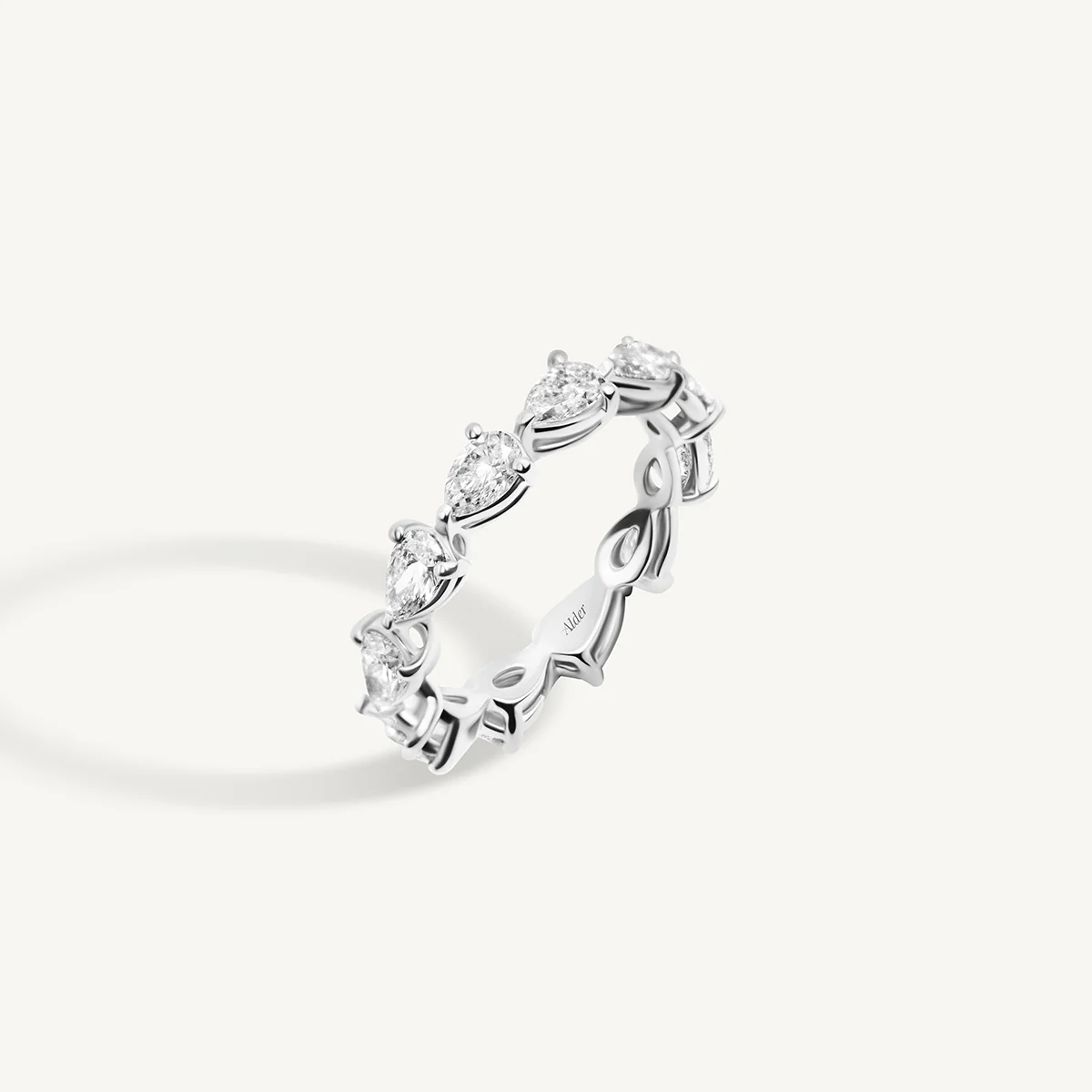 A modern take on the classic eternity band, the Sideways Pear Diamond Eternity Band features pear-cut diamonds set in a unique horizontal orientation, creating an elegant and contemporary silhouette. This refined design enhances the natural brilliance of each diamond, offering a seamless flow of radiance around the band.